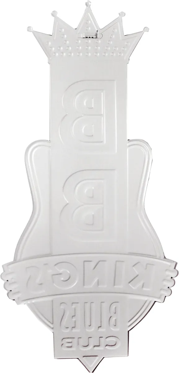 Metallbilde formet som en gitar med en krone på toppen med teksten 'BB King´s Blues Club'. Perfekt for samlingen av retro skilt, de som liker de som liker musikk, Blues, Jazz, pynt for garasjen og hjemmedekorasjon for hjemmet, for de som liker gamle retro reklame plakater og nostalgi.