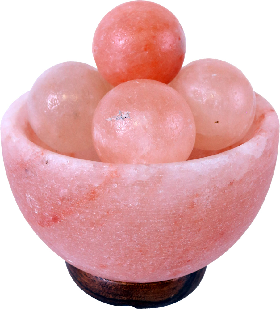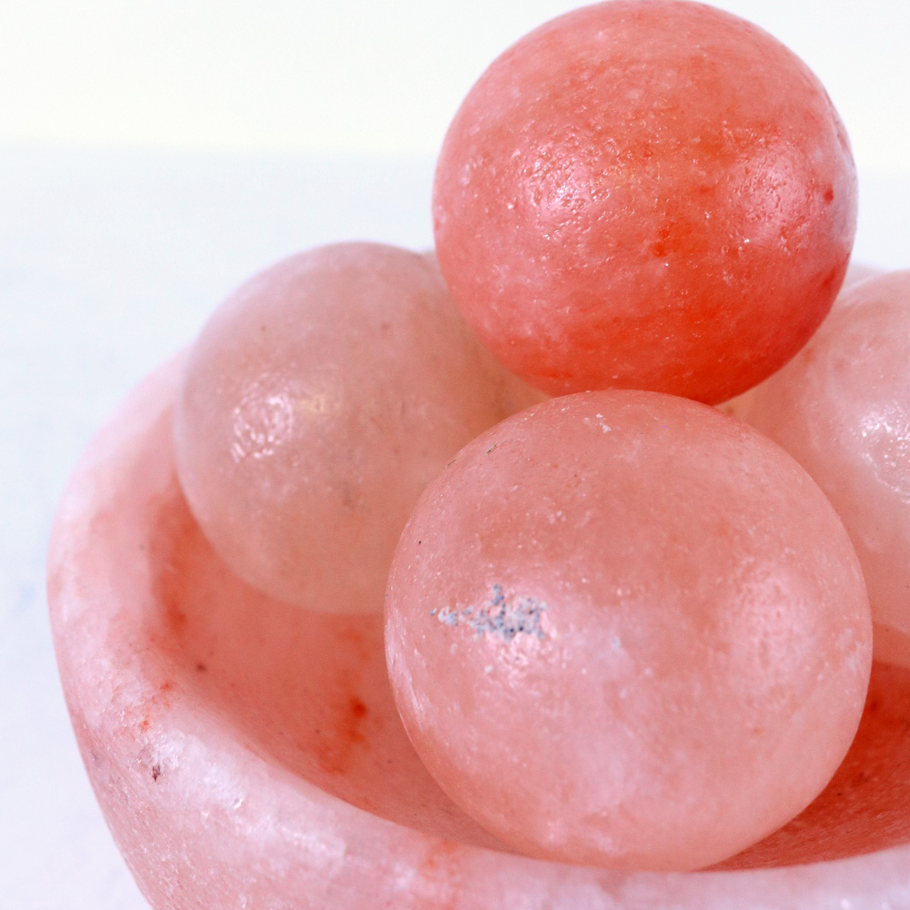 En vakker skål med saltstein der løse malte kuler av krystallen ligger. Hver saltkrystall er skåret for hånd, fra de gamle Himalaya fjellene, og er derfor helt unik i form, farge og vekt.