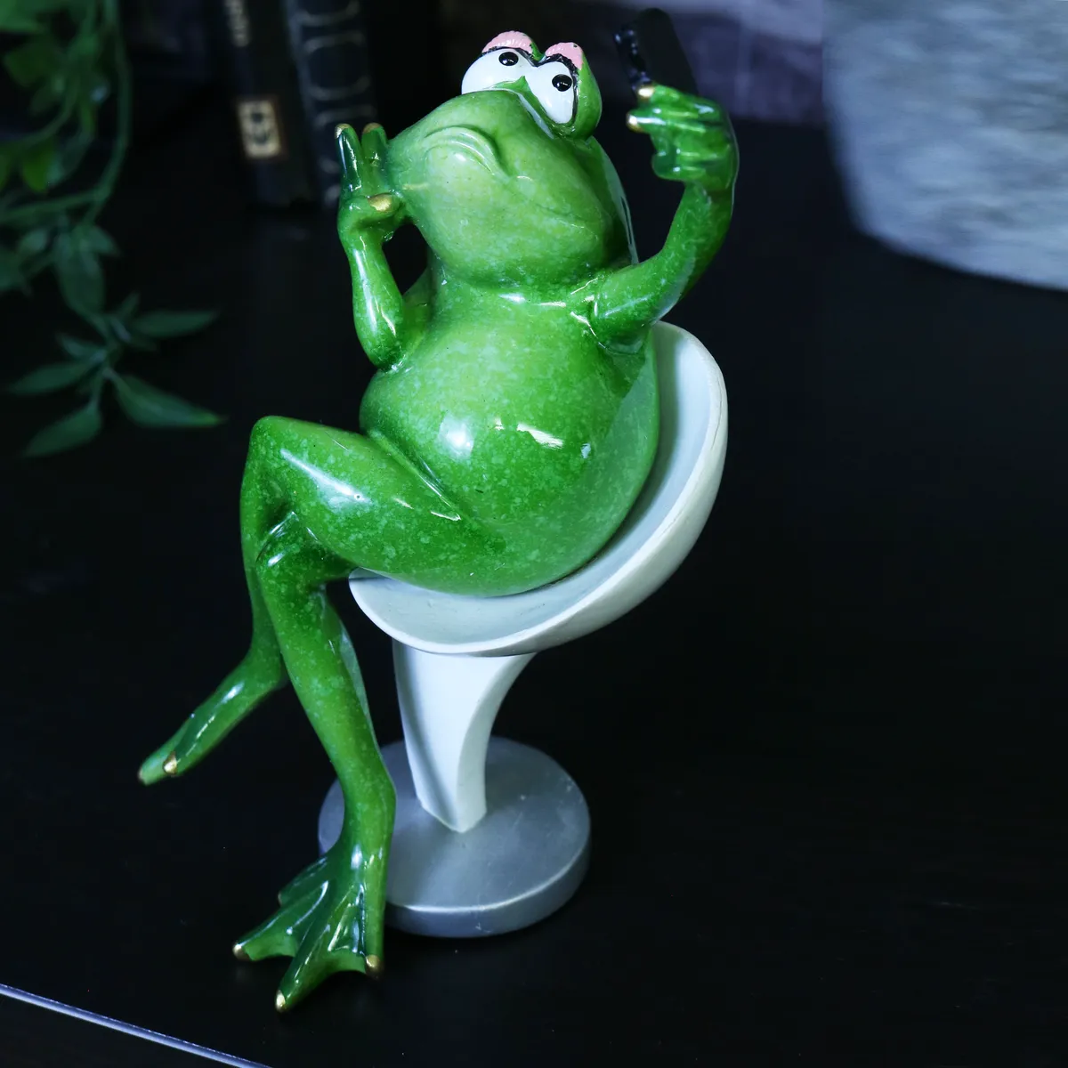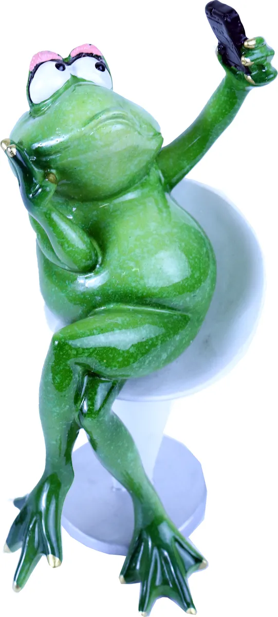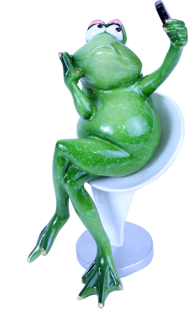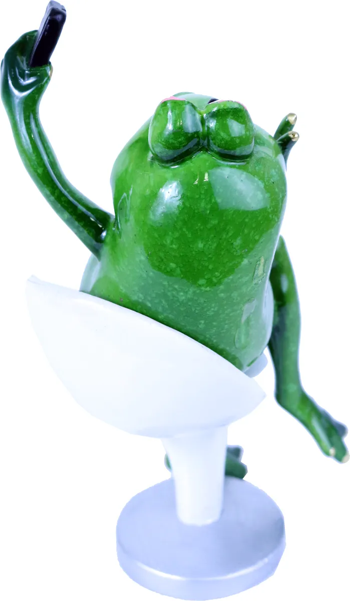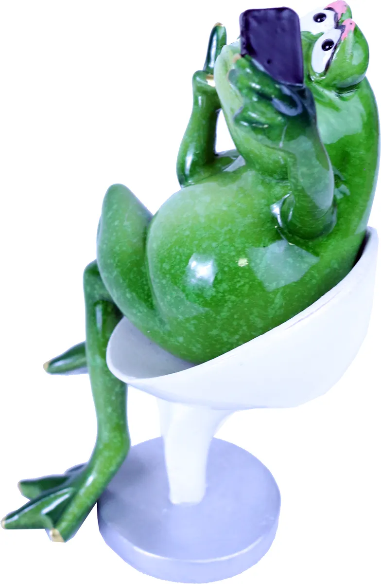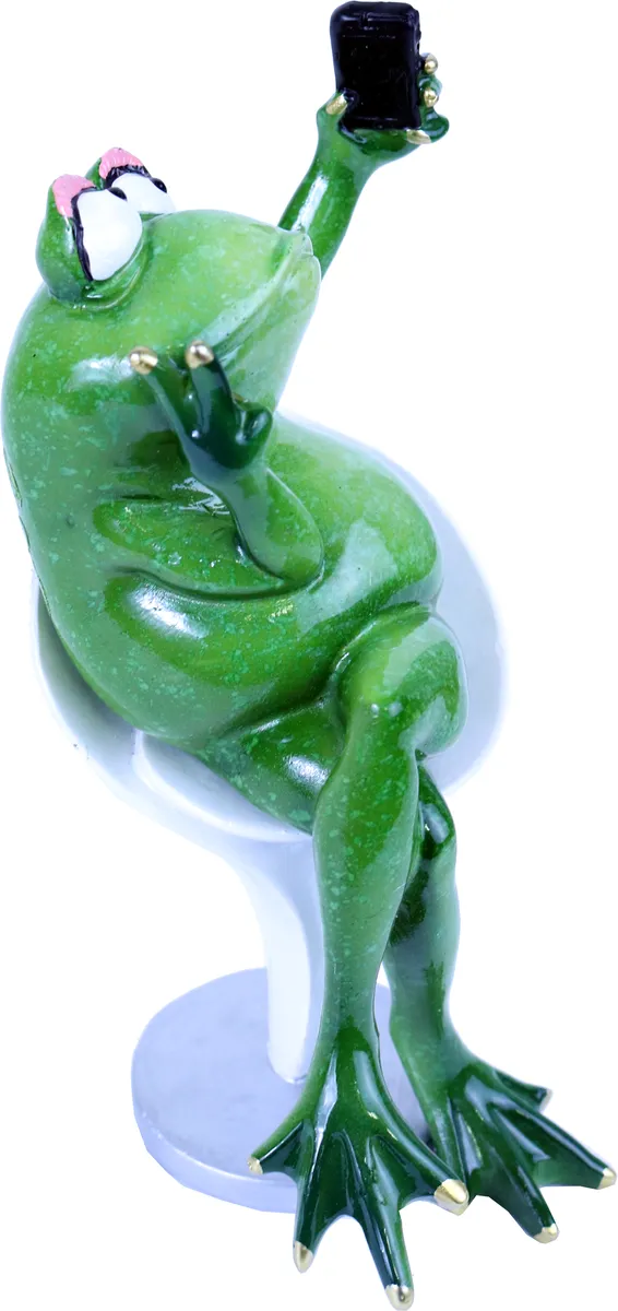 Selfie frosk. Sitter på en stol og tar en selfie. Håndmalt pynteting med fine gulldetaljer og nydelig grønn farge.