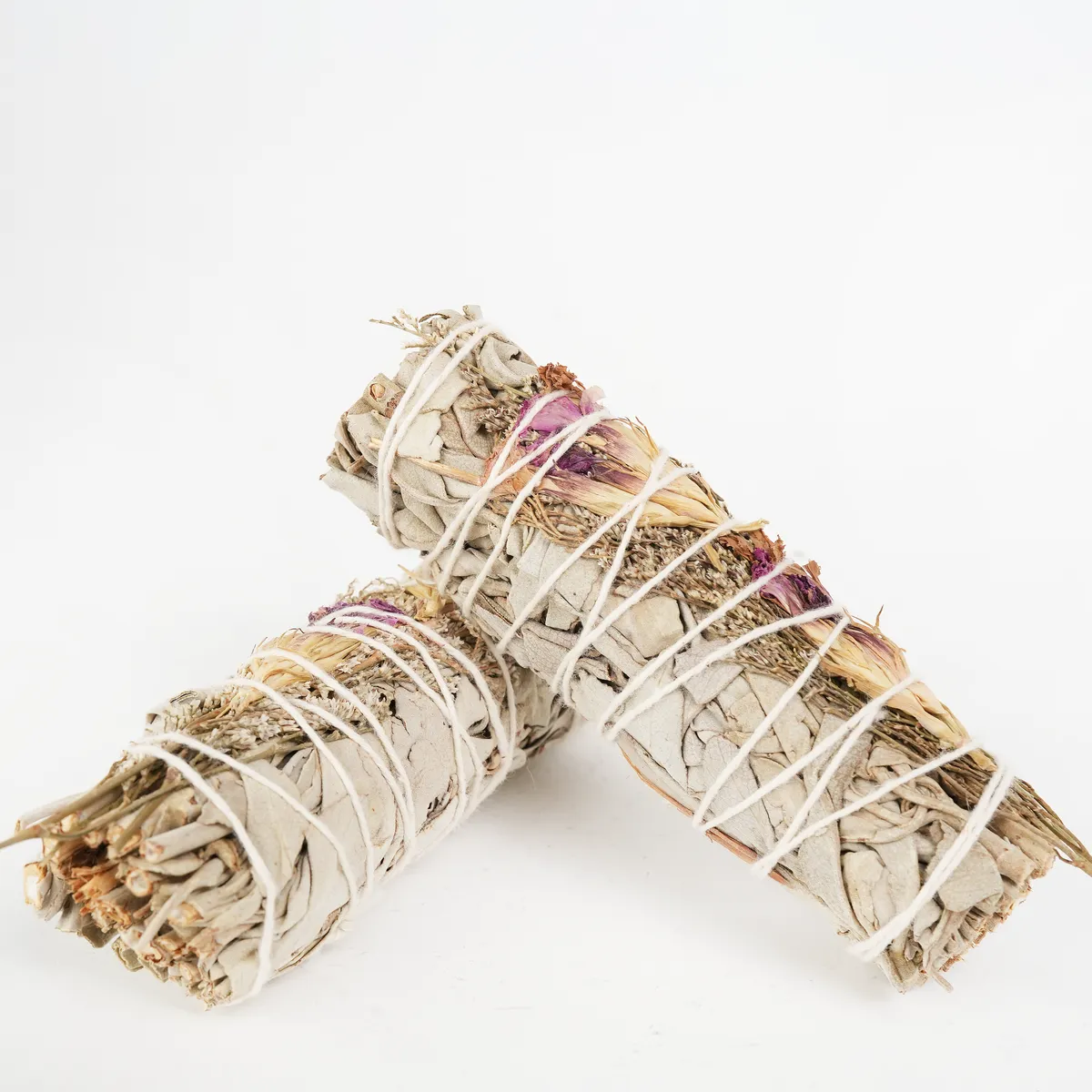 Opprinnelsesland: Mexico. “Peaceful Aura” er en vakker smudge-bunt av hvit salvia, varsomt dekorert med tørkede blomster i beroligende farger. Kombinasjonen er skapt for å støtte indre ro, balanse og en myk, stillferdig energi. Hvit salvia brukes tradisjonelt til å rense rom, gjenstander og energier, mens blomstene bidrar med en følelse av harmoni, nærvær og fred. Tenn forsiktig enden av bunten til den begynner å gløde og avgi røyk. Blås ut flammen og la den gløde sakte. Før røyken rundt deg selv, i rommet eller over gjenstander du ønsker å rense. Ha alltid et brannsikkert fat eller en skål i nærheten for å fange opp aske og slokke bunten når du er ferdig. La aldri en tent smudge være uten tilsyn.