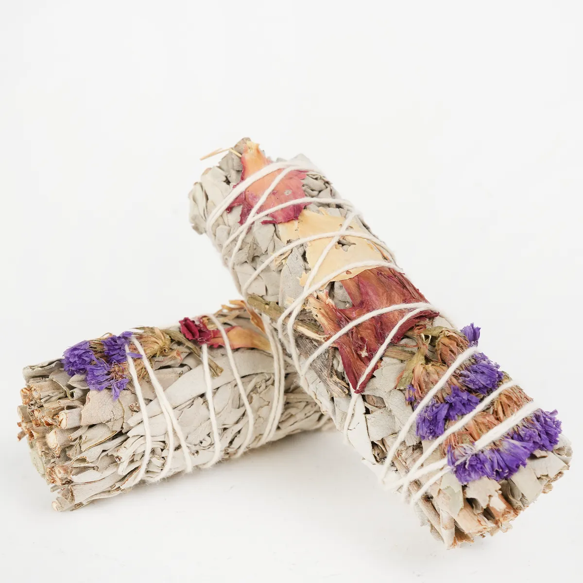 Opprinnelsesland: Mexico. DDenne vakre smudge-bunten av hvit salvia er dekorert med tørkede blomster og skapt for å spre en lett, positiv og harmonisk energi. Hvit salvia brukes tradisjonelt til rensing av rom, gjenstander og energier, mens blomstene symboliserer glede, balanse og et åpent sinn. “Happy Spirit” er spesielt verdsatt ved ritualer for velvære, ny begynnelse og når du ønsker å skape en lys og innbydende atmosfære. Tenn forsiktig enden av bunten til den begynner å gløde og avgi røyk. Blås ut flammen og la den gløde sakte. Før røyken rundt deg selv, i rommet eller over gjenstander du ønsker å rense. Ha alltid et brannsikkert fat eller en skål i nærheten for å fange opp aske og slokke bunten når du er ferdig. La aldri en tent smudge være uten tilsyn.