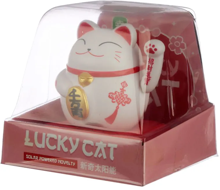 Bobblehead Solcellefigur Lucky Cat, vrikker med labben når den lille solcellen fylles med sollys. Perfekt på dashbordet i bilen eller hjemme i vinduet.