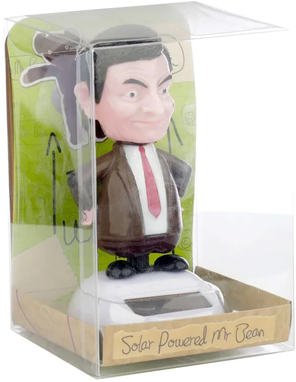 Bobblehead Solcellefigur Mr. Bean rister på kroppen og hodet når den lille solcellen er fylt med sollys. Perfekt på dashbordet i bilen eller hjemme i vinduet.