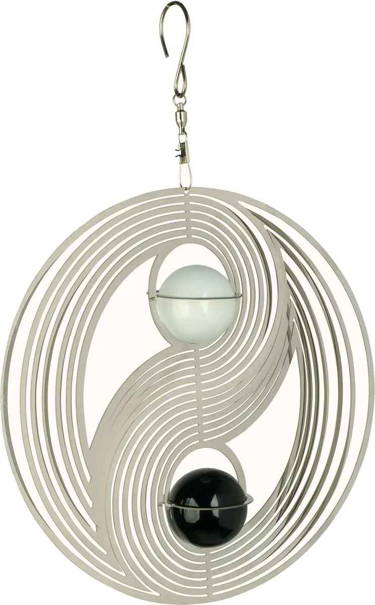 Dekorativ Yin Yang spiral vindmølle i metall med to glassballer som roterer fint i vinden og gir et effektivt lysspill av solen. Perfekt hagedekorasjon, stemningsfull selv som pynteting innendørs.