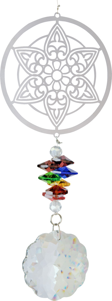 Dekorativ mandala spiral vindspinner i metall med flere krystaller som fint roterer i vinden og gir et effektivt lysspill fra solen. Perfekt hagepynt, stemningsfullt også som innendørs dekorasjon.