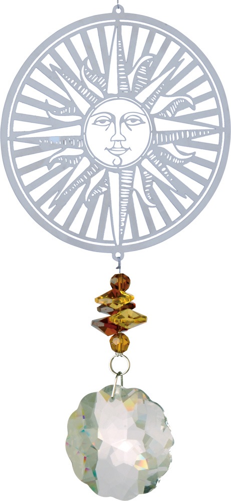 ekorativ solspiral vindspinner i metall med flere krystaller som roterer forsiktig i vinden og gir et effektivt lysspill fra solen. Perfekt hagepynt, stemningsfullt også som innendørs dekorasjon.