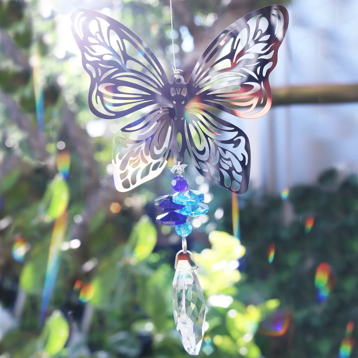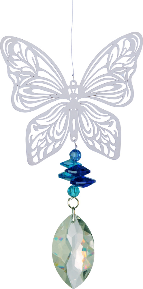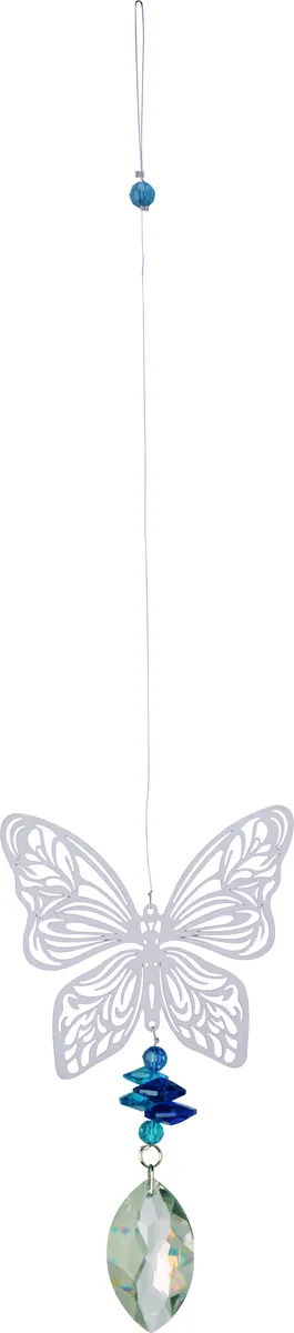 Dekorativ sommerfuglspiral vindspinner i metall med flere krystaller som fint roterer i vinden og gir et effektivt lysspill fra solen. Perfekt hagepynt, stemningsfullt også som innendørs dekorasjon.