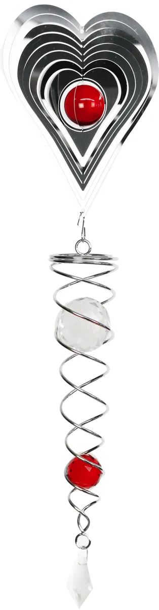 Dekorativ hjerte spiral vindmølle i metall med to glaskrystaller som roterer pent i vinden og gir et effektivt lett spill av solen. Perfekt hagedekorasjon, stemningsfull selv som et ornament innendørs.