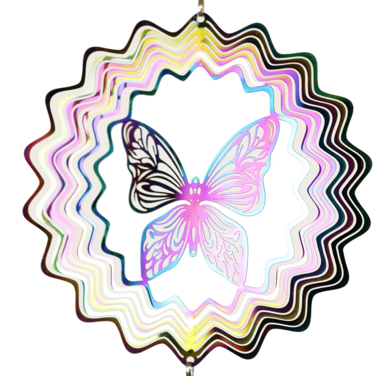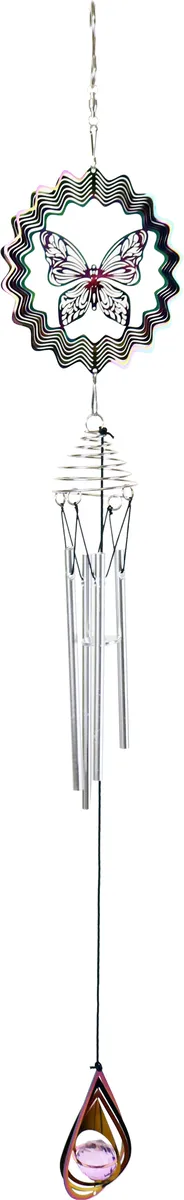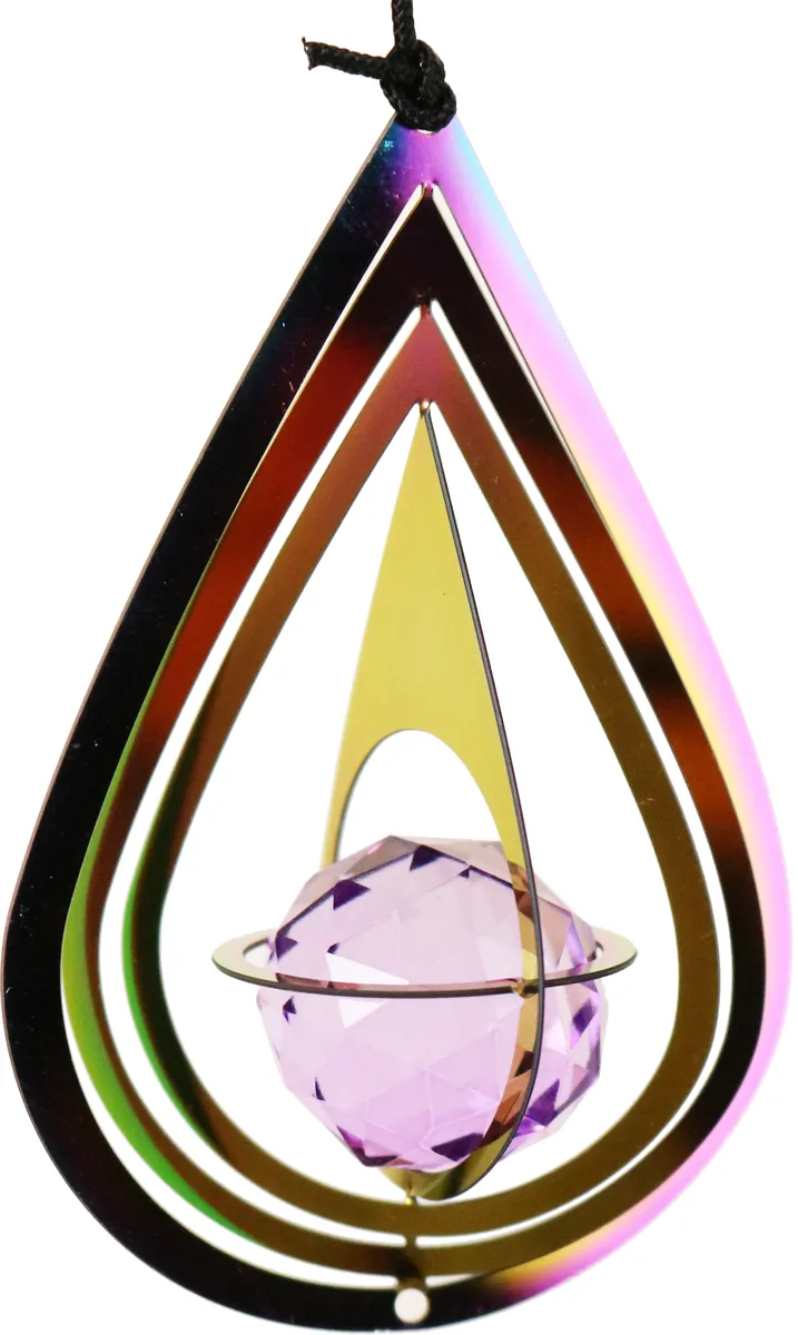 Dekorativ solfanger spiral vindspinner i metall med en glasskrystall i bunnen. Vindklokken har bensinlignende farger som roterer forsiktig i vinden og gir et effektivt lysspill fra solen. Perfekt hagepynt, stemningsfullt også som innendørs dekorasjon.