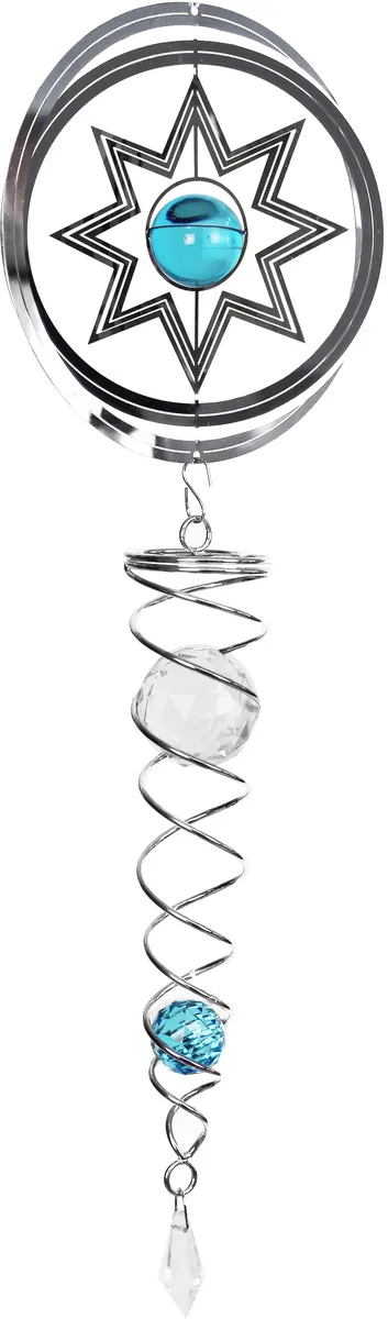 Dekorativ stjerne spiral vindmølle i metall med to glaskrystaller som roterer pent i vinden og gir et effektivt lett spill av solen. Perfekt hagedekorasjon, stemningsfull selv som et ornament innendørs.